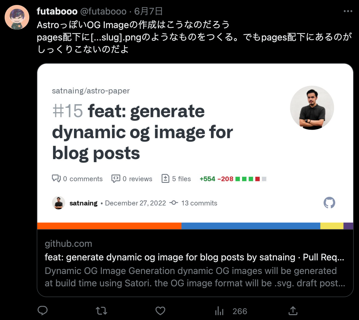 今回の自分の方法は SSG ということになるとおもいます。OGImage 自体は build 時に作成して dist 配下に保存してあります。SSR で作成する方法もあり、それはこの記事の最初にはった GitHub の画像のリポジトリで行われている方法で、Astro の Endpoints 機能を使って実現されています。